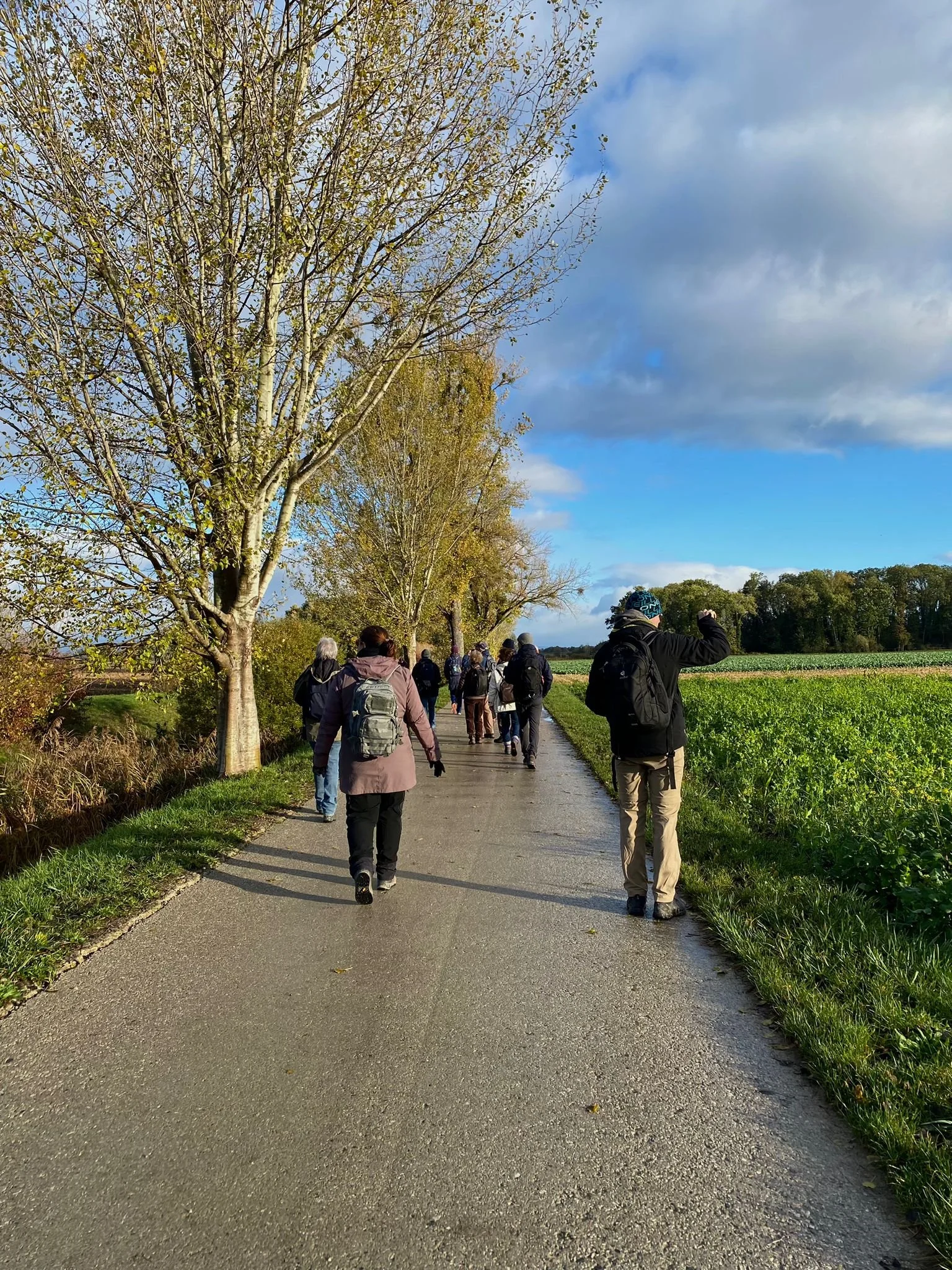 Le cri plaintif de Tarins des aulnes nous fait lever le nez. Deux individus tombent sur de hautes branches et se laissent observer facilement. Nous poursuivons notre route, à l’affût du moindre petit oiseau brun qui fait bouger les feuilles fragiles des haies. Un groupe de Moineau domestiques se fait remarquer. Deux Fauvettes à tête noires jouent dans les branchages. Juste à côté, une Grive Mauvis nous émerveille. Une grande première pour la plupart des participants ! Sa cousine la Grive draine sera repérée quelques instants plus tard, haut dans un arbre. Ses cris la trahissent. Avant notre arrivée au Marais de Sionnet, un Pipit farlouse siffle dans un arbre avant de survoler un champ de brassicacées.
