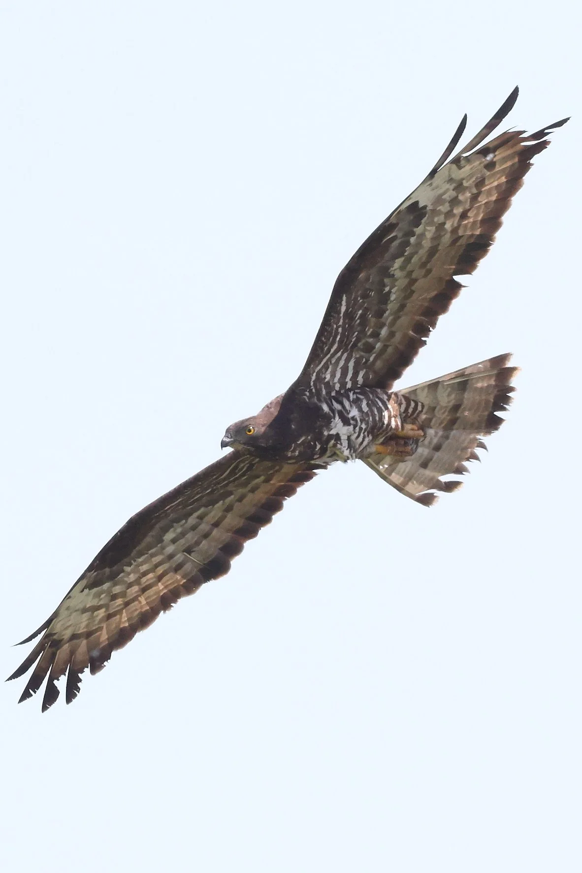 La bondrée possède une queue assez longue, au moins aussi longue que la largeur de l'aile, voire plus longue, ce qui lui donne une silhouette particulière. Les ailes sont terminées par des doigts bien découpés. La queue présente généralement trois barres sombres, deux petites et une large bande terminale.