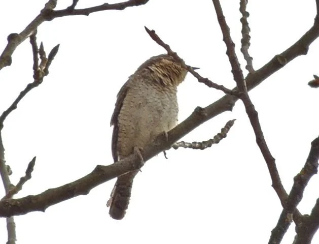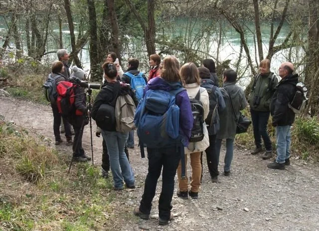 Un nid de Milan noir est repéré sur un arbre en haut des falaises, mais cette observation est bientôt détournée par un appel qui suscite la curiosité de chacun : une série de sons perçants et nasillards : pas de doute, c'est le Torcol fourmilier, dont le chant nous parvient du Moulin-de-Vert, de l'autre côté du Rhône. Nous sommes toutes oreilles dirigées vers la source de ce chant qui se répète de manière totalement aléatoire. Va-t-il se montrer ? Le mimétisme parfait de cet oiseau discret ne nous laisse souvent peu de chance de le voir. Et soudain, en gagnant les Teppes de Véré, c'est le coup de chance inespéré : un autre torcol, nous attend perché sur une branche bien en vue. Est-ce la femelle (sa voix plus ténue et comme en sourdine pourrait nous le faire penser) ou un autre mâle ? Toujours est-il que cette observation restera longtemps dans les mémoires de chacun.