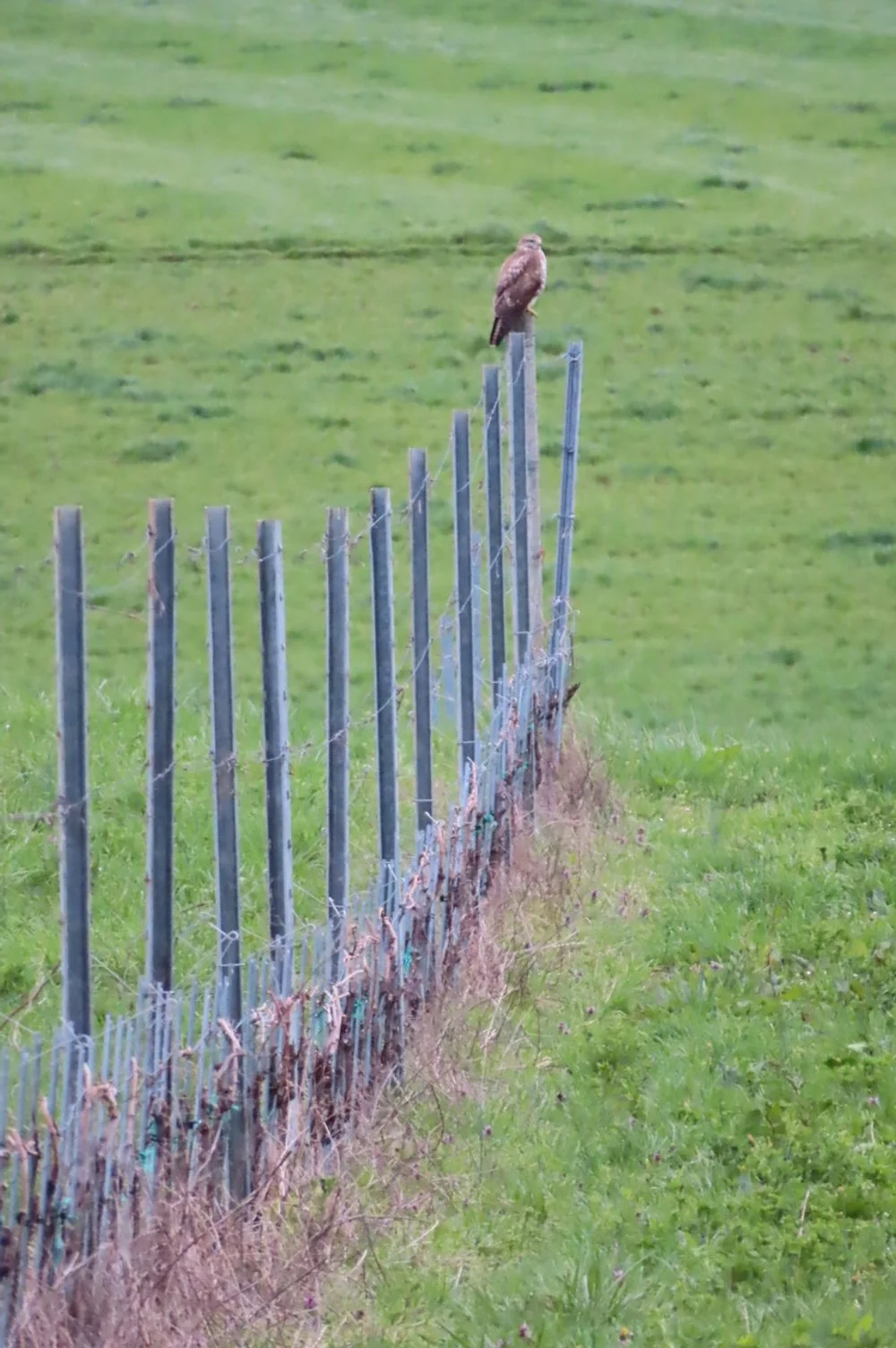 Il y a également des Étourneaux sansonnets, des Pigeons ramiers, une Tourterelle turque, sans oublier les Merles noirs et les Mésanges charbonnières et bleues. En arrivant dans un verger, de nombreux fringilles nous accueillent avec leur chant : on y observe Verdiers d’Europe, Chardonnerets élégants et un Serin cini. Au-dessus du village, on peut voir toute une colonie de corvidés, formée de nombreuses Corneilles noires et de Corbeaux freux se nourrissant dans un pré. Mêlés à eux, un ou deux Choucas des tours. Le vol furtif d’un Epervier d’Europe est repéré par l’un d’entre nous au moment de nous diriger vers le vignoble. Ce sont encore des rapaces qui attirent l’œil : une Buse variable posée sur un piquet et un Milan noir en vol, avec dans le bec du matériel pour construire son nid.