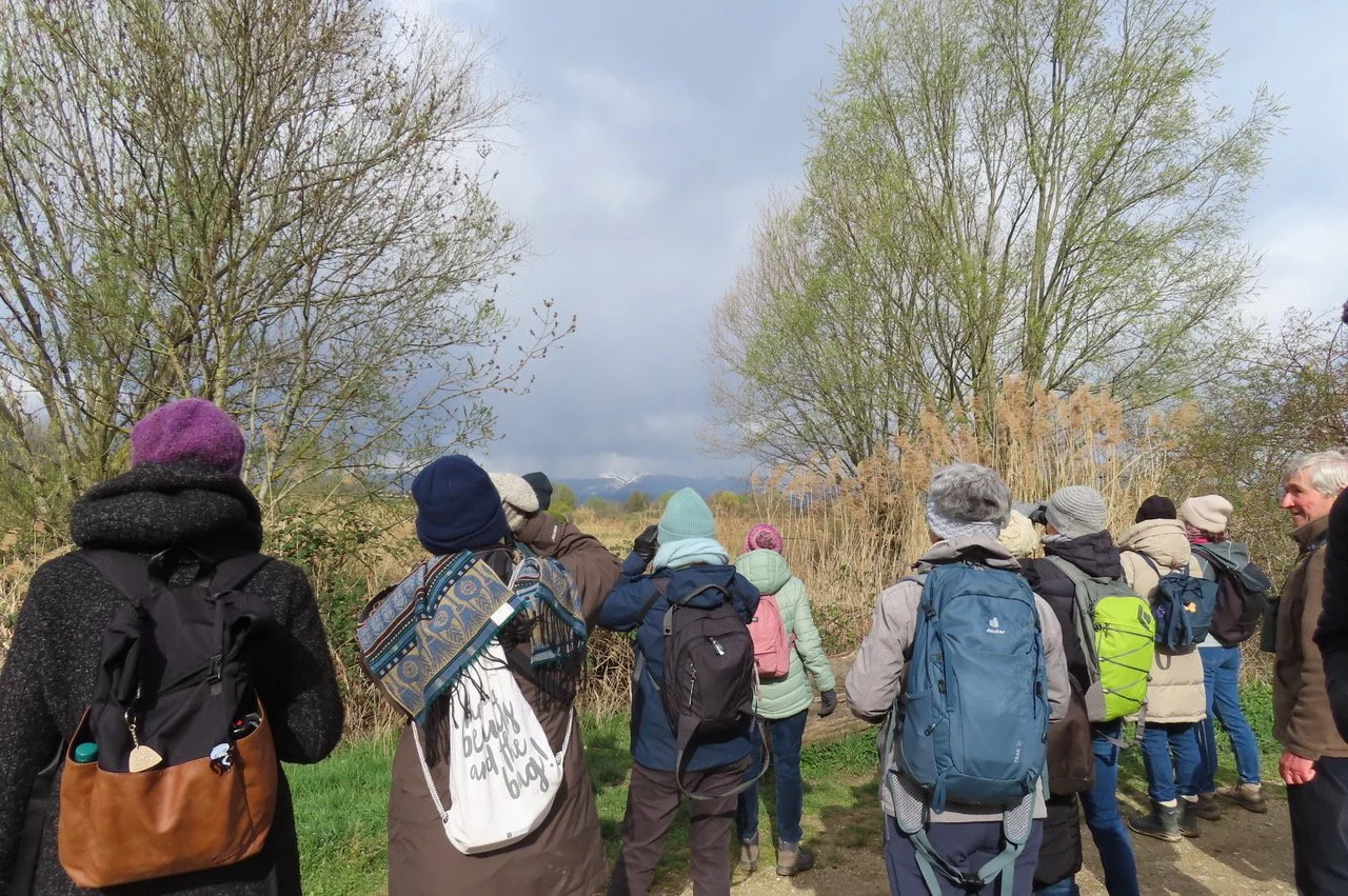 Nous empruntons le chemin qui longe la Touvière pour rejoindre les Marais de Sionnet que nous parcourons en nous mélangeant par moment aux autres groupes. Grâce à la connaissance approfondie de Christian concernant l’histoire récente des lieux (processus de renaturation du marais et de renouvellement du patrimoine arboré de la commune de Meinier), nous comprenons mieux les enjeux et les modalités des actions entreprises ici en faveur de la biodiversité. A l’issue de cette balade fort instructive, nous arrivons à la Ferme de la Touvière pile à l’heure pour le café.