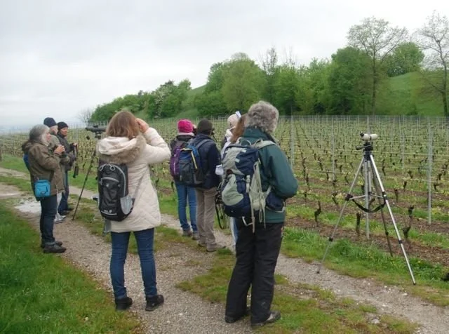 On se dégourdit les jambes pour gagner le plus haut point du canton: c'est là que se cantonne le Pouillot fitis qui profite d'un espace plus ouvert pour entonner ses strophes délicates. Nous parcourons du regard les immenses étendues des vignes pour tenter de surprendre le vol papillonnant d'une huppe: ce ne sera pas pour cette fois ! Nous nous contenterons d'un chant lointain d'une Alouette des champs et du passage d'une Linotte mélodieuse. Une série de sons nasillards attirent notre attention : bien camouflé à l'intérieur d'un nichoir, un Torcol fourmilier entonne sa strophe répétitive, bientôt imité par la femelle reconnaissable à sa strophe plus étouffée et plus aigüe. Un véritable duo s'engage pour notre plus grand plaisir !